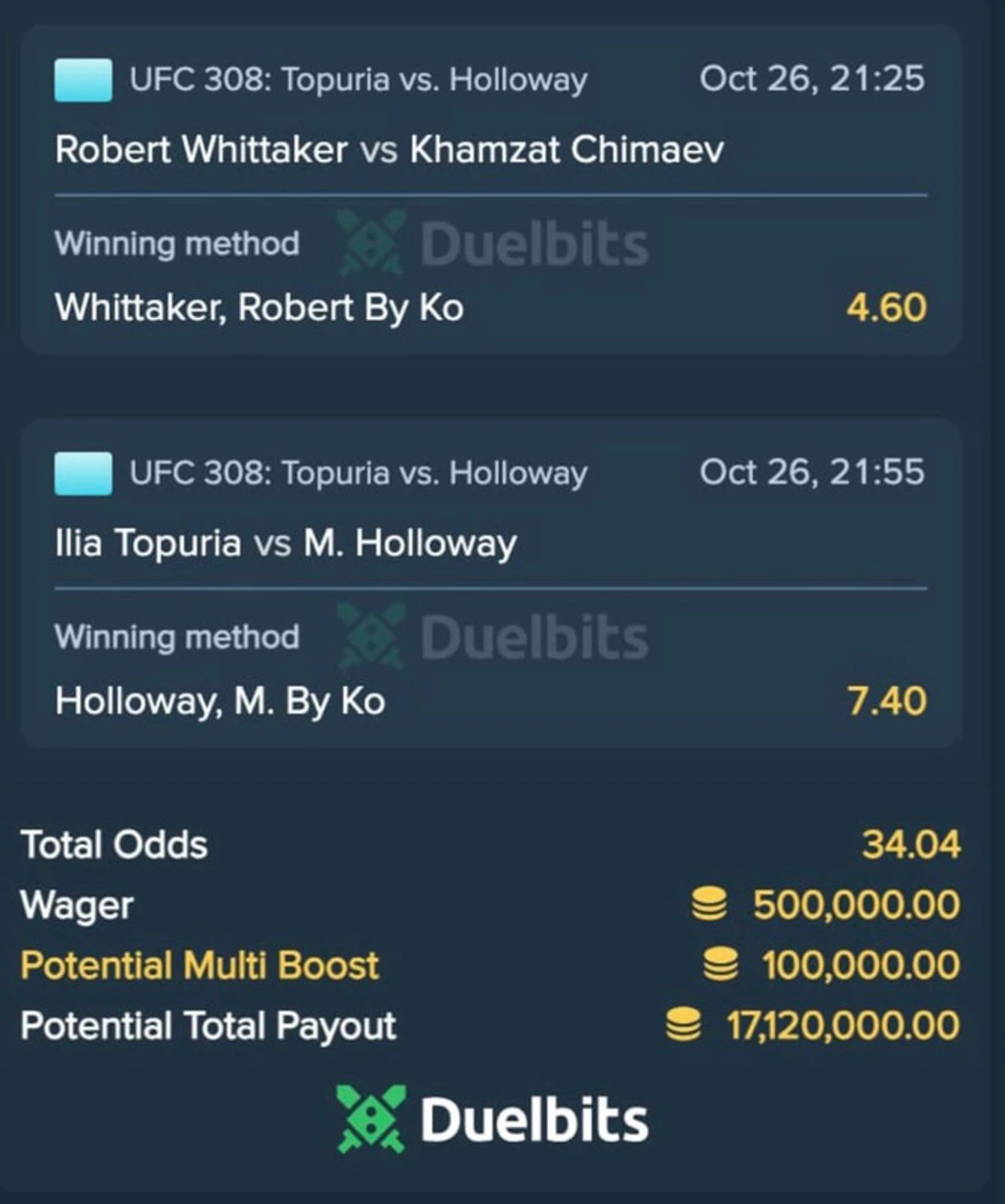 Ирландец составил экспресс из двух поединков на турнире UFC 308 – Илия Топурия против Макса Холлоуэя и Роберт Уиттакер против Хамзата Чимаева. Макгрегор поставил на победу Уиттакера и Холлоуэя нокаутом.