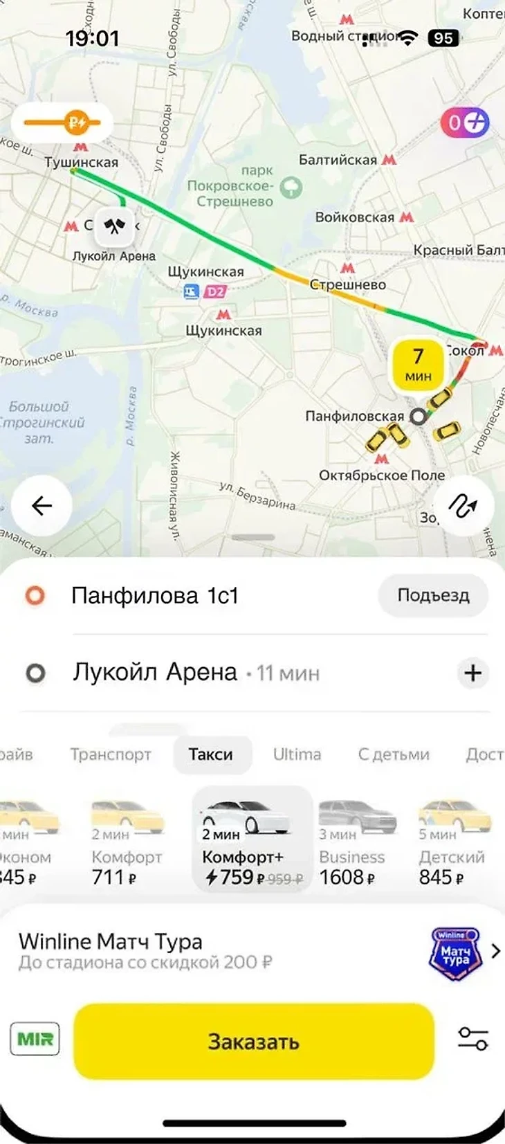 Условия получения скидки просты: необходимо заказать такси Комфорт или Комфорт+ на стадион проведения Winline матча тура или обратно с него, скидка применится автоматически. Стоит отметить, что скидка будут действовать за несколько часов до и после матча и только для поездок, где начальной или конечной точкой является стадион. Каждый пользователь может воспользоваться скидкой только на 1 поездку в рамках матча.