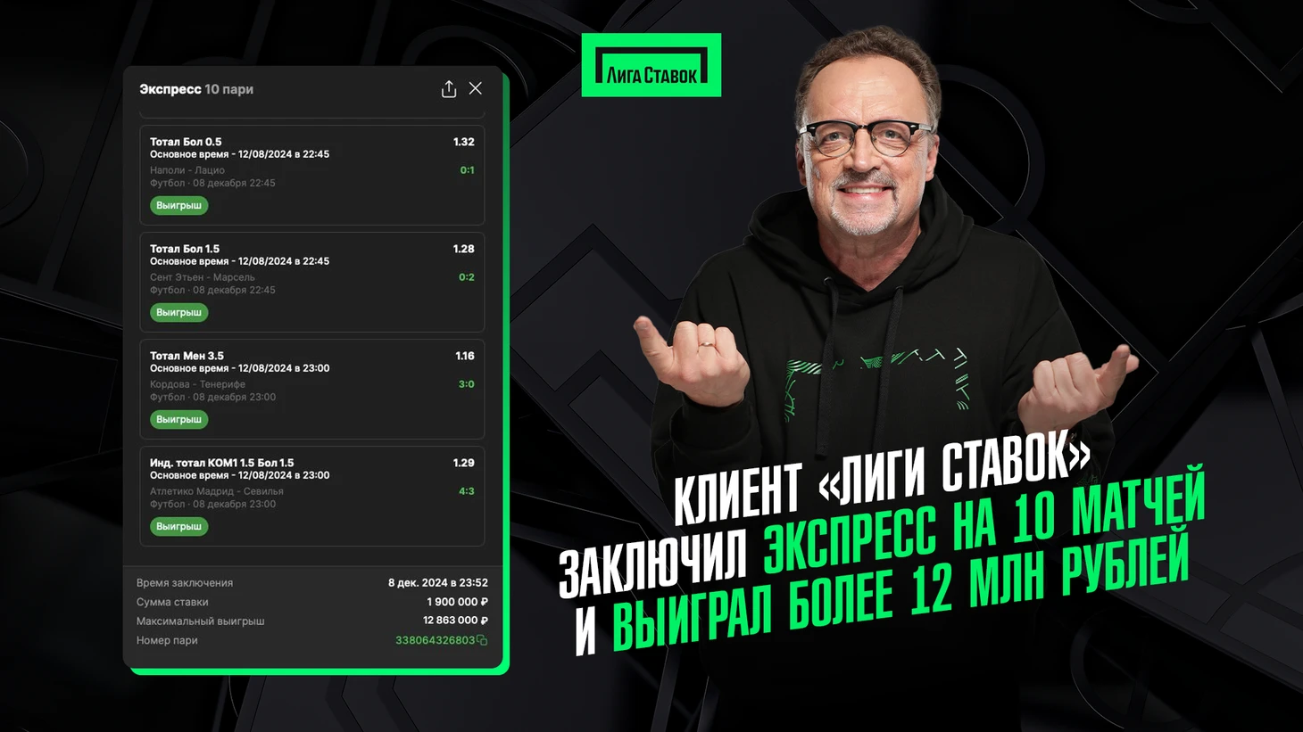 Пользователь «Лиги Ставок» 8 декабря, в воскресенье, заключил пари на 1 900 000 рублей и выиграл 12 863 000 рублей. Коэффициенты варьировались от 1,16 до 1,34. Он собрал экспресс из 10 событий, в которые вошли матчи и футбольных чемпионатов, и Национальной хоккейной лиги. Примечательно, что на футбол беттор ставил в режиме live исключительно на тоталы.