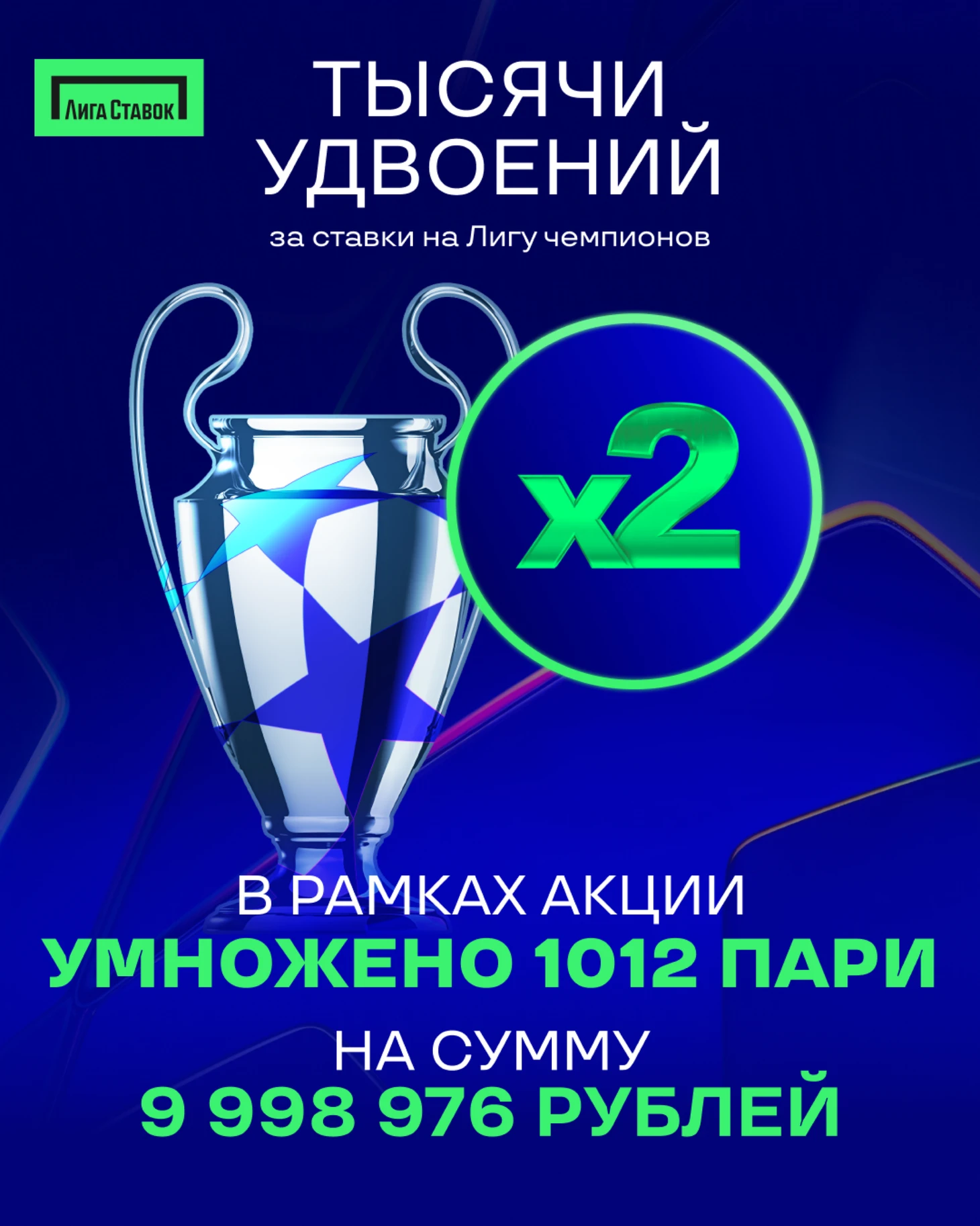 Всего было умножено 1012 пари на общую сумму 9 998 976 рублей. Эти цифры подтверждают высокий интерес и активное участие пользователей «Лиги Ставок», которые не упустили возможность увеличить свои выигрыши.