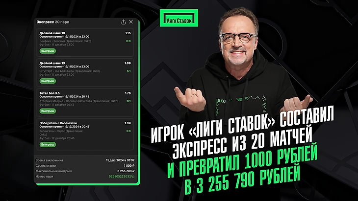 • Игрок «Лиги Ставок» составил экспресс из 20 матчей и превратил 1000 рублей в 3 255 790 рублей