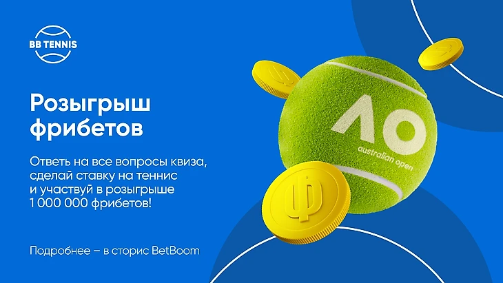 Разыгрывается миллион фрибетов среди всех любителей тенниса к этому турниру. Переходите по ссылке, отвечайте на вопросы квиза, сделайте ставку от 500 рублей на теннис с кэфом от 1.8 и забирайте свою часть от миллиона. BetBoom – теннис в лучшем виде!