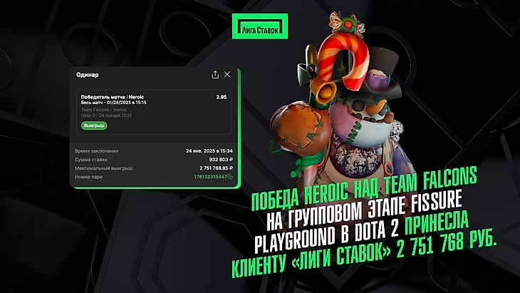 Победа HEROIC над Team Falcons на групповом этапе FISSURE PLAYGROUND в Dota 2 принесла клиенту «Лиги Ставок» 2 751 768 рублей