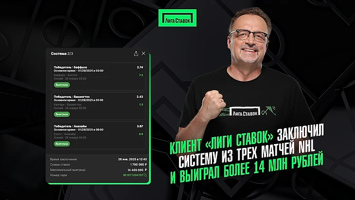 Клиент «Лиги Ставок» заключил систему из трех матчей NHL и выиграл более 14 млн рублей