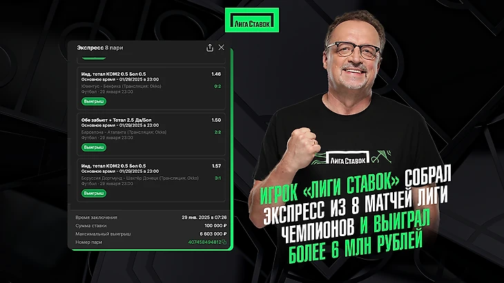 Игрок «Лиги Ставок» собрал экспресс из 8 матчей Лиги чемпионов и выиграл более 6 млн рублей