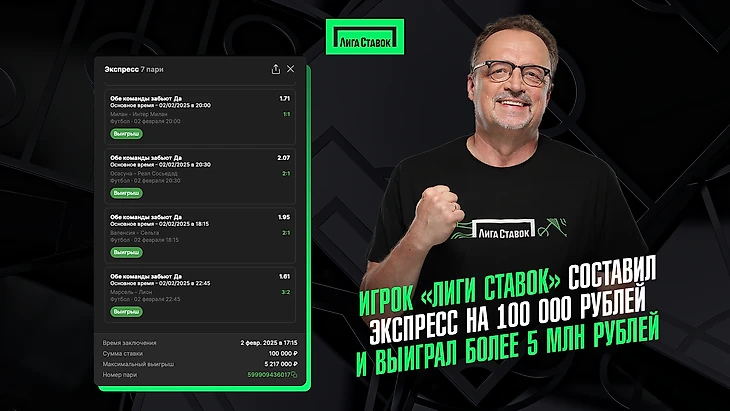Игрок «Лиги Ставок» составил экспресс на 100 000 рублей и выиграл более 5 млн рублей