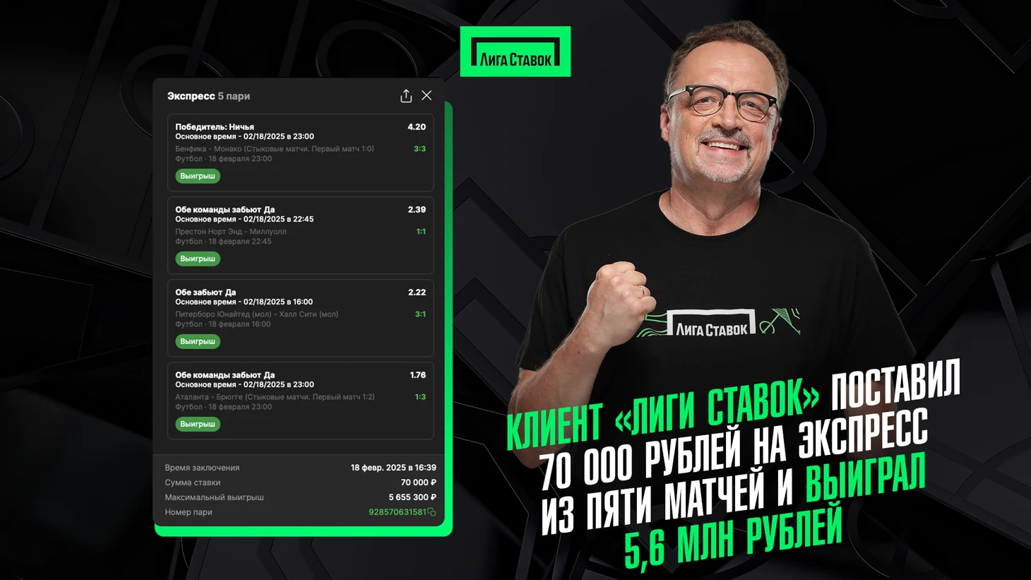 Во вторник, 18 февраля, пользователь «Лиги Ставок» составил экспресс из пяти футбольных матчей. Он поставил 70 000 рублей на коэффициент 80,79 и выиграл более 5 655 300 рублей.