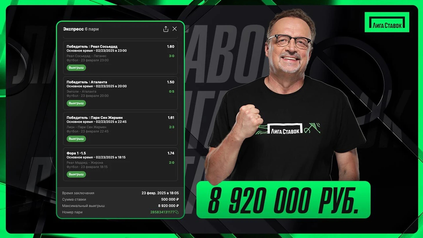 Игрок «Лиги Ставок» собрал экспресс из 6 матчей и выиграл более 8 млн рублей