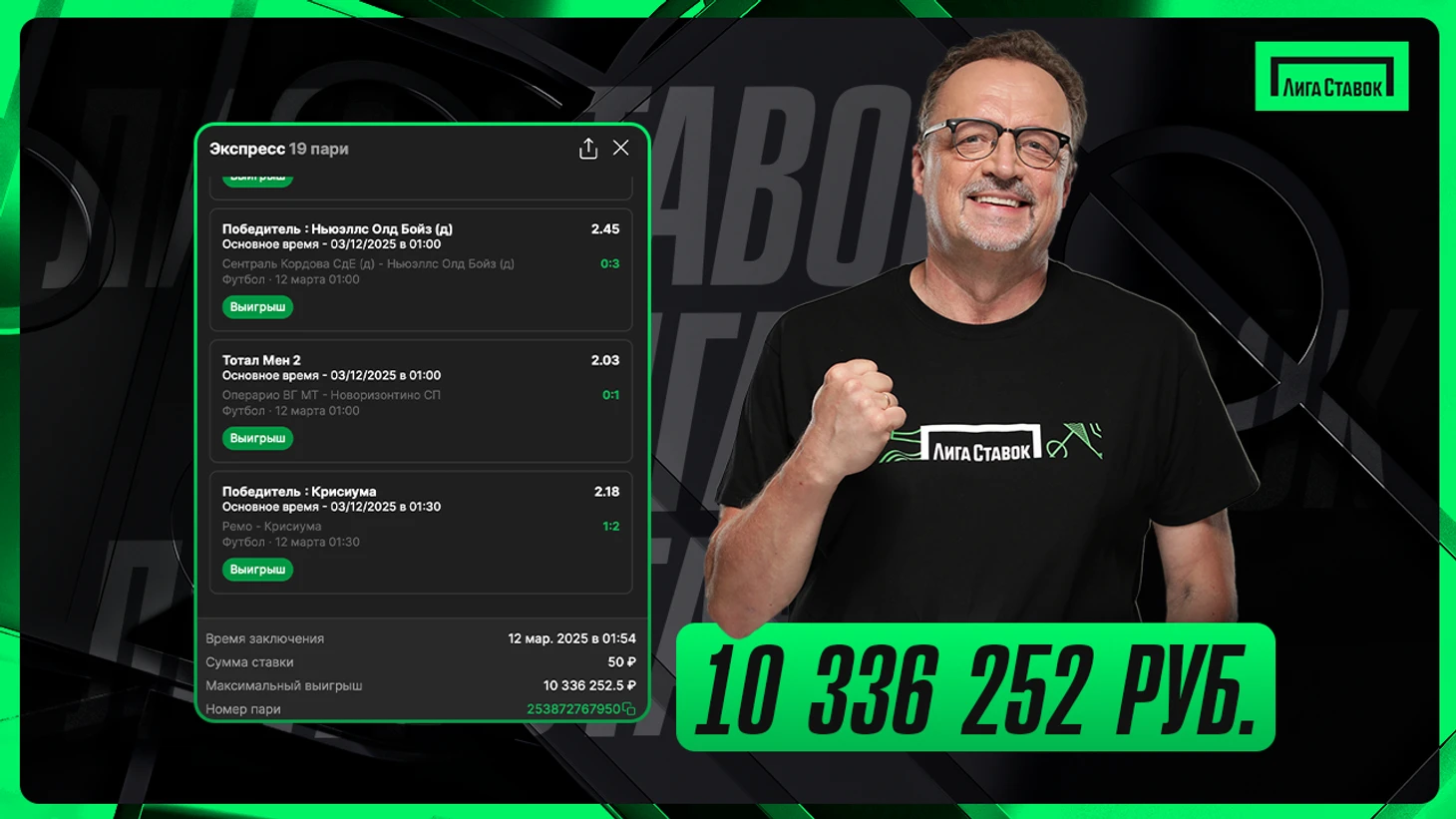 Клиент «Лиги Ставок» выиграл более 10 миллионов рублей со ставки в 50 рублей.