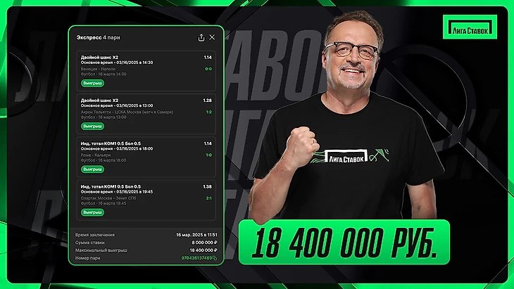 В воскресенье, 16 марта, игрок «Лиги Ставок» составил экспресс из четырех матчей. Сумма ставки — 8 млн рублей, коэффициент — 2,29, а сумма выигрыша — 18,4 млн рублей.