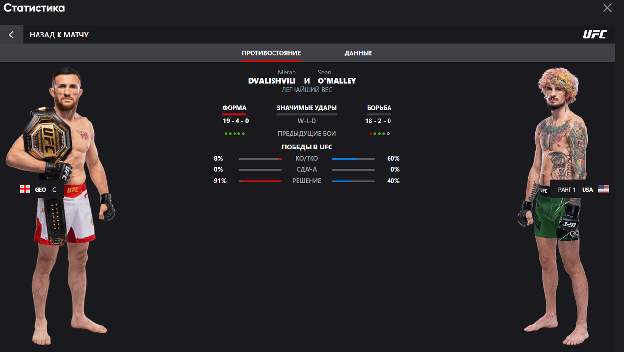 Букмекерская компания BetBoom внедрила два новых специализированных виджета, которые предоставят пользователям платформы подробный доступ к статистике турниров и боев UFC. Инструменты уже доступны на сайте и в мобильном приложении.