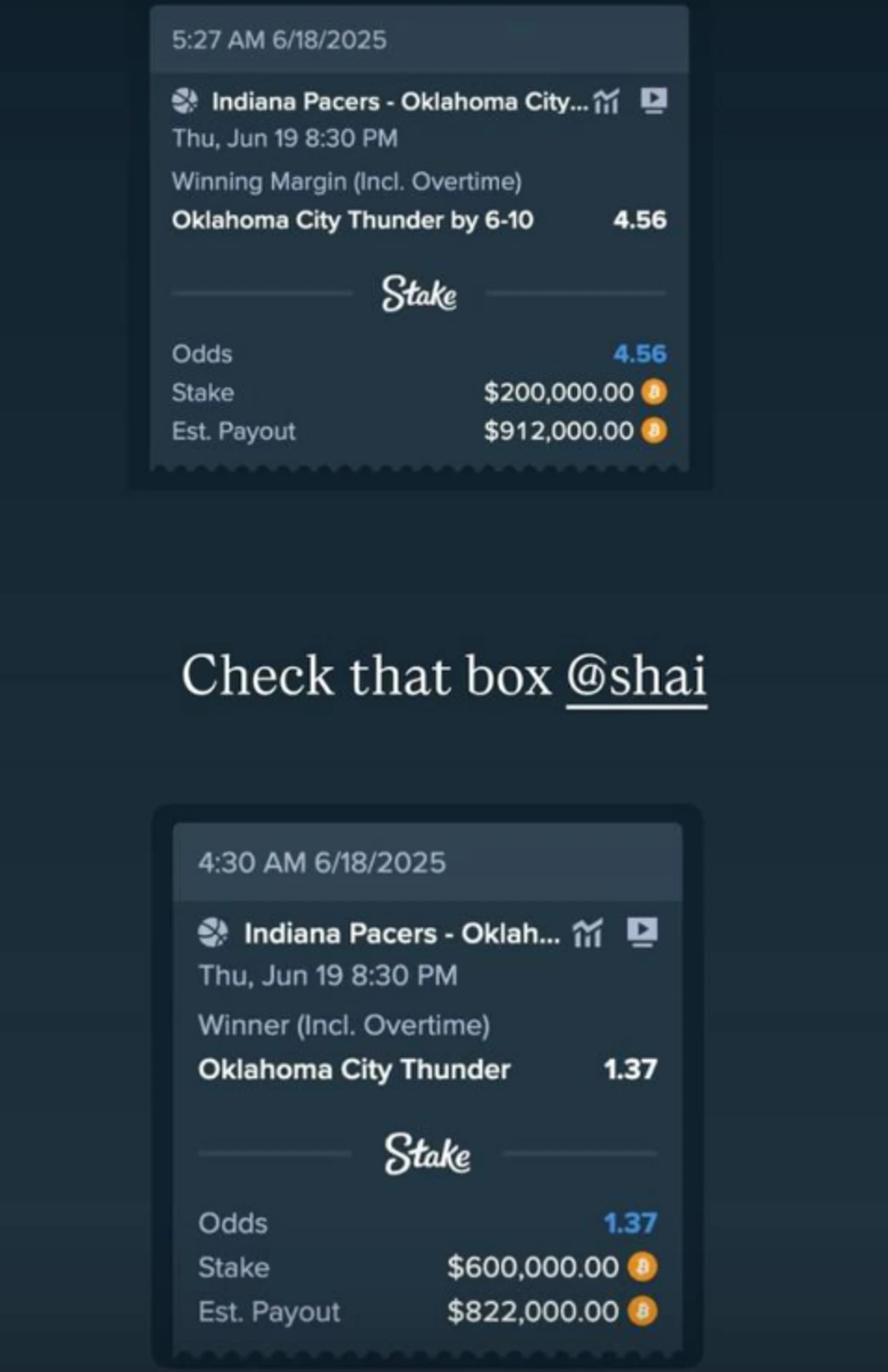 Канадский музыкант поставил 200 тысяч долларов на победу «Оклахомы» над «Индианой» с разницей в 6-10 очков с коэффициентом 4.56 и 600 тысяч на обычную победу «Тандер» с учетом овертайма за 1.37.