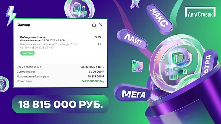 28 июня стартовал плей-офф клубного чемпионата мира по футболу. Клиент «Лиги Ставок» сосредоточил свое внимание на матче «Бенфика» — «Челси». Он заключил одинар на ничейный исход за коэффициент 3,55. Сумма ставки — 5 300 000 рублей, а итоговый выигрыш составил 18 815 000 рублей.