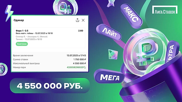 13 июля прошел финал Уимблдона в мужском разряде между Янником Синнером и Карлосом Алькарасом. Клиент «Лиги Ставок» заключил одинар на победу итальянца с форой -3,5 по геймам за коэффициент 2,60. Сумма ставки — 1 750 000 рублей, а итоговый выигрыш составил 4 550 000 рублей.