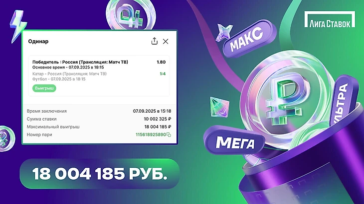 7 сентября состоялся товарищеский матч между сборной Катара и сборной России. Пользователь «Лиги Ставок» заключил одинар на победу россиян за коэффициент 3,50. Сумма ставки — 10 002 325 рублей, а итоговый выигрыш составил 18 004 185 рублей.