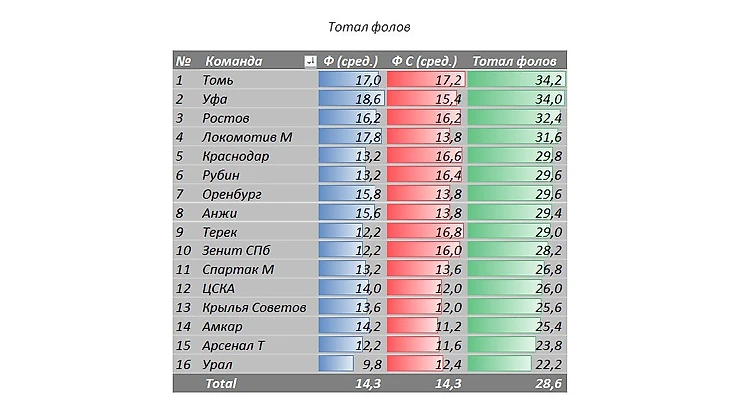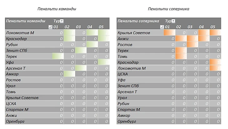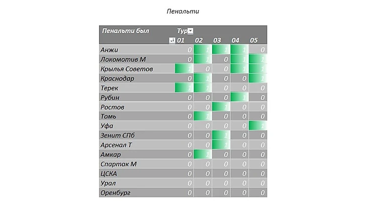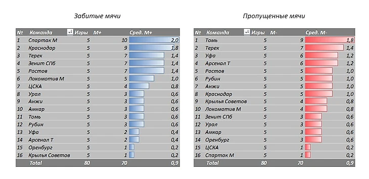 М.А.: По форам все предельно ясно. Я, честно говоря, крайне редко использую данный инструмент. Зато им очень увлечён мой коллега. В таблице наглядно можно оценить, что минимально играют две команды: ЦСКА и Локомотив. А крупные победы одержало только 4 клуба: Спартак, Зенит, Ростов и Краснодар.