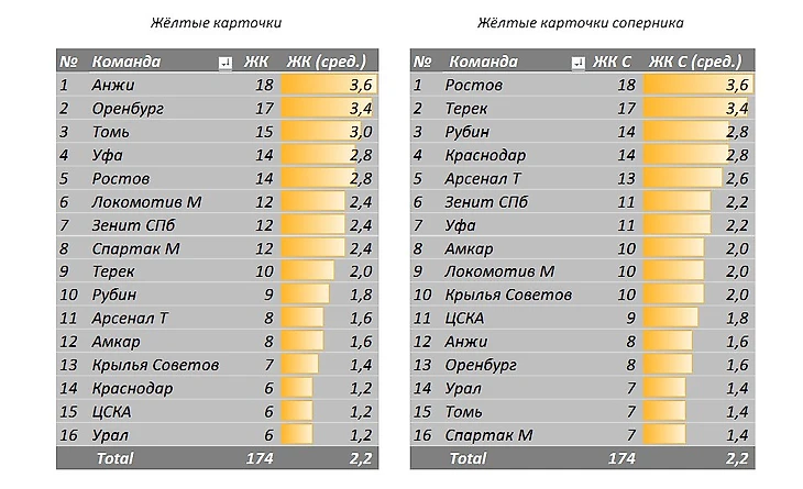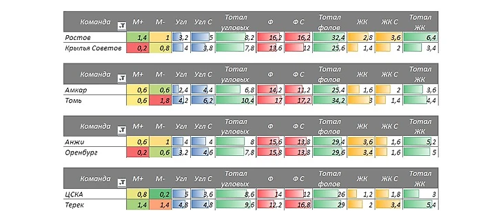 М.И.: Анжи и Оренбург - вот это пара! Средний Тотал по желтым в игре - 5 карточек. Давайте проверимся, даст ли плюс на плюс - минус. Тотал меньше 5 карточек вполне можно заиграть. Минимальное количество карточек в матчах Рубин - Урал и ЦСКА - Терек и победа Ростова и Томи по карточкам в своих очных встречах - тенденции ближайшего тура.