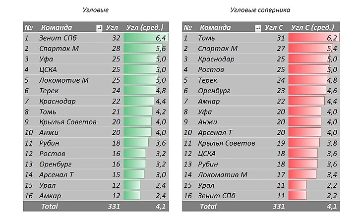 М.А.: Последующие таблицы в дополнительных комментариях не нуждаются. Угловые, фолы и желтые карточки - это основная двигающая сила в ставках на статистику. Совсем не сложно сопоставить данные по тем, командам, чьи матчи вас больше всего интересует в туре. Кажется что в центральном матче тура будет пробит верх по угловым, а вот Оренбург с Анжи скорее сыграют ни. Ну и победа Амкара по угловым в матче с Томтю, это то, на что бы я с удовольствием посмотрел.