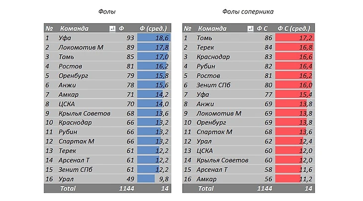 М.И.: Мой фаворит номер 3 в ставках, после угловых и желтых. Сразу в глаза бросается грубость Локомотива и Уфы, а так же показатели в матчах с участием Томи. По всем парам с этими командами можно быть уверенным, что фолов будет немало. А вот предстоящий матч Рубина и Урала похоже не должен набрать намного больше 20 фолов.