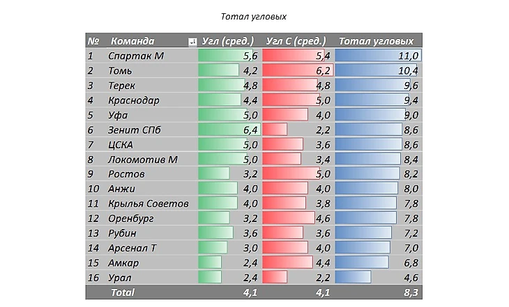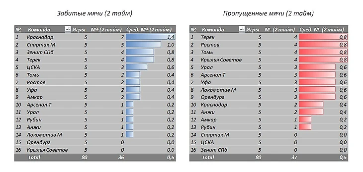 М.А.: Наиболее распространённая ставка на футбольные матчи наряду с исходами и ставкой "обе забьют". Что-либо комментировать дополнительно не вижу смысла. Посмотрим, какова вероятность перед 6-м туром для каждой команды и сравним эти показатели в очных встречах. Отдельно хочется сказать, что в рамках "Оцифровки" мы не даем варианты для ставок, мы лишь делаем обзор на основе анализа статистики для более успешного подбора вариантов. Поэтому такие вещи, как смена тренера, невыплата заработной платы игрокам, внутренние конфликты и иные события просто не могут быть учтены. При прочтении этого текста нужно адекватно понимать, что статистка это лишь вариант улучшения своей ставочной стратегии. Не более.