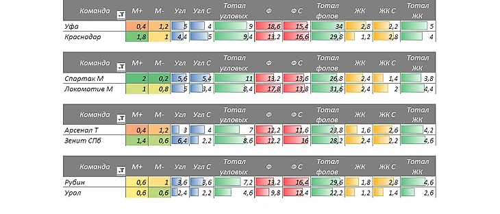И.С.:Ну и по итогам всего вышесказанного получаются вот такие сводные таблицы по каждому матчу. В них основыные показатели слева направо: средние голы команд, средние угловые, фолы, ЖК.