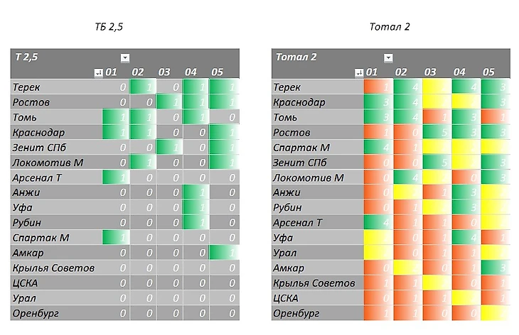 И.С.: ТБ 2,5 - в этой таблице слева направо показаны первые 5 туров, при этом 1 означает, что тотал в 2,5 в игре пробивался, а 0 означает, что ничего подобного не происходило. Для наглядности я подсветил единицы зелёным цветом.