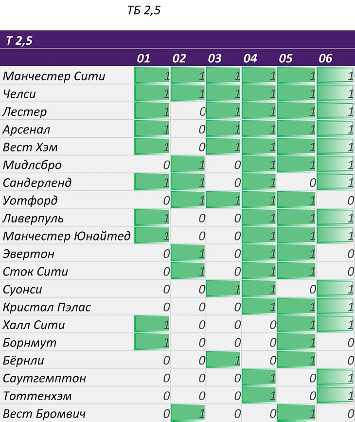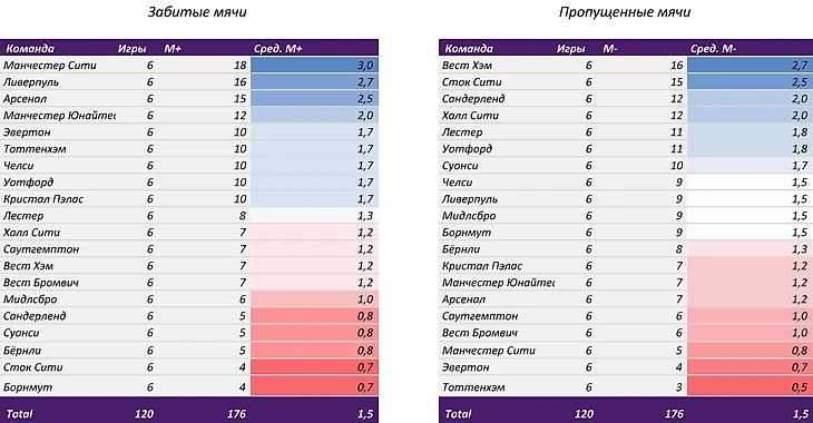 Манчестер Сити и Челси в 6 матчах из 6 играли тотал больше 2,5. Делйте выводы. Близко к ним Арсенал, Лестер и Вест Хэм (потому что очень много пропускает). А вот играть ТБ 2,5 в матчах Вест Бромвича и Тоттенхэма я лично не стал бы.