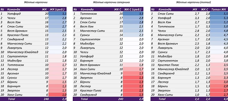 И снова лидер по грубости - Уотфорд. Самая не грубая команда - Халл Сити. А больше всего желтых на себе собирает Тоттенхэм. Надо ставить на победу по ЖК на его противников.
