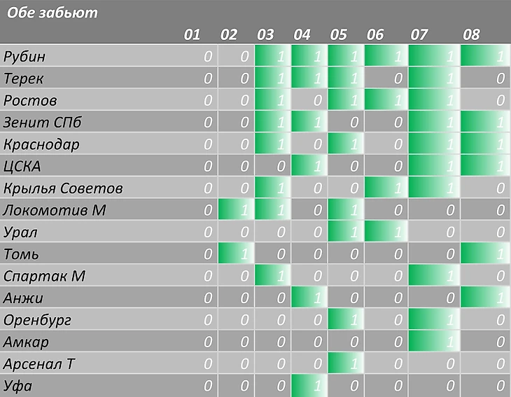 7. Ростов - ЦСКА - вероятность 43,75%. Обе забьют. Высокая вероятность.