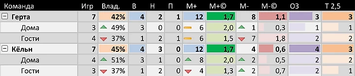 Это говорит о том, что в теории Кельн имеет все возможности забить и увезти очки. Пара не подходит для ставок на результат, как не крути.