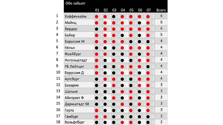 Заметили, кстати, что в отличии от РФПЛ в Бундеслиге к 7 туру, команд, котрые играеют редко ставку "обе забьют" всего две. Это Гамбург и Вольфсбург. Все остальные так или иначе учавствовали в результативных играх.