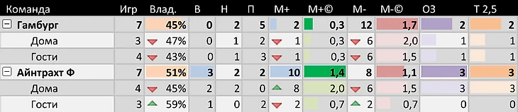 Домашняя фора 2,2 Гамбурга, против выездной форы 0,5 на Айнтрахт. Это значит, что Айнтрахт в среднем играет на выезде вничью, а Гамбург проигрывает с разницей в 2 мяча. Теперь посмотрим на статистику голов Гамбурга дома и Айнтрахта на выезде. Для приличия надо сказать, что Гамбург и дома, и в гостях забивает очень мало. Айнтрахт пропускает на выезде меньше гола за игру. Есть все предпосылки, что бы предположить, что Гамбург не забьет, а Айнтрахт выиграет.