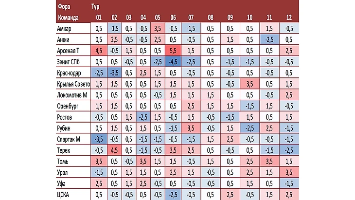 Статистика по форам. Для тех, кто разбирается в том, что такое фора, все должно быть понятно. При этом в таблицах Н2Н есть среднее значение форы в общем и в разбивке на домашний и гостевой поединок. Так что, если не очень хочется разбираться в этой табличной форме и считать вероятности, то смотрим формат Н2Н и сопостовляем форы по конкретным соперникам.