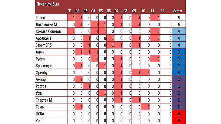 Пенальти. Тут вообще достаточно долгое время без изменений: в матчах Терека и Локомотива чаще всего назначались пенальти - по 5, а вот в играх с участием Урала и ЦСКА одиннадцатиметровых не было. Я лично дважды в этом сезоне поймал Локомотив. Думаю, что именно на них и есть резон ставить чаще других.