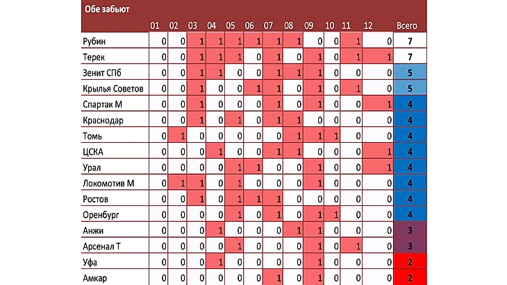 Итого за 12 туров средний проход ставки на обе забьют составляет 33,3%, т.е. 1/3 часть игр или не более 2 игр за тур.