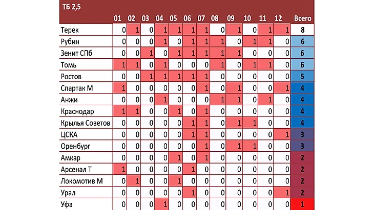 Итого средний проход ТБ 2,5 после 12 туров составил - 30,2%. Вывод примерно такой же, как и по ОЗ.