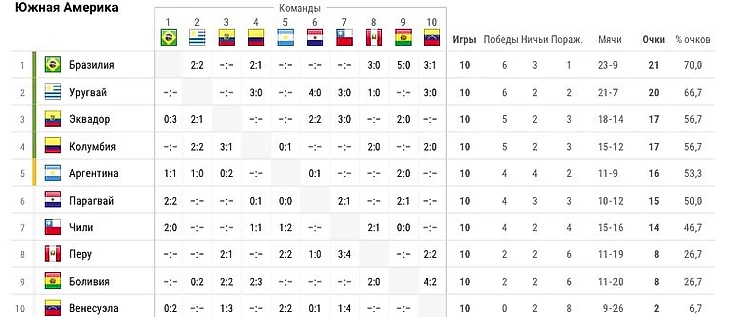Что вообще имеем на сию минуту в этих диковинных футбольных джунглях? Вашему вниманию турнирная таблица отборочной зоны КОНМЕБОЛ: