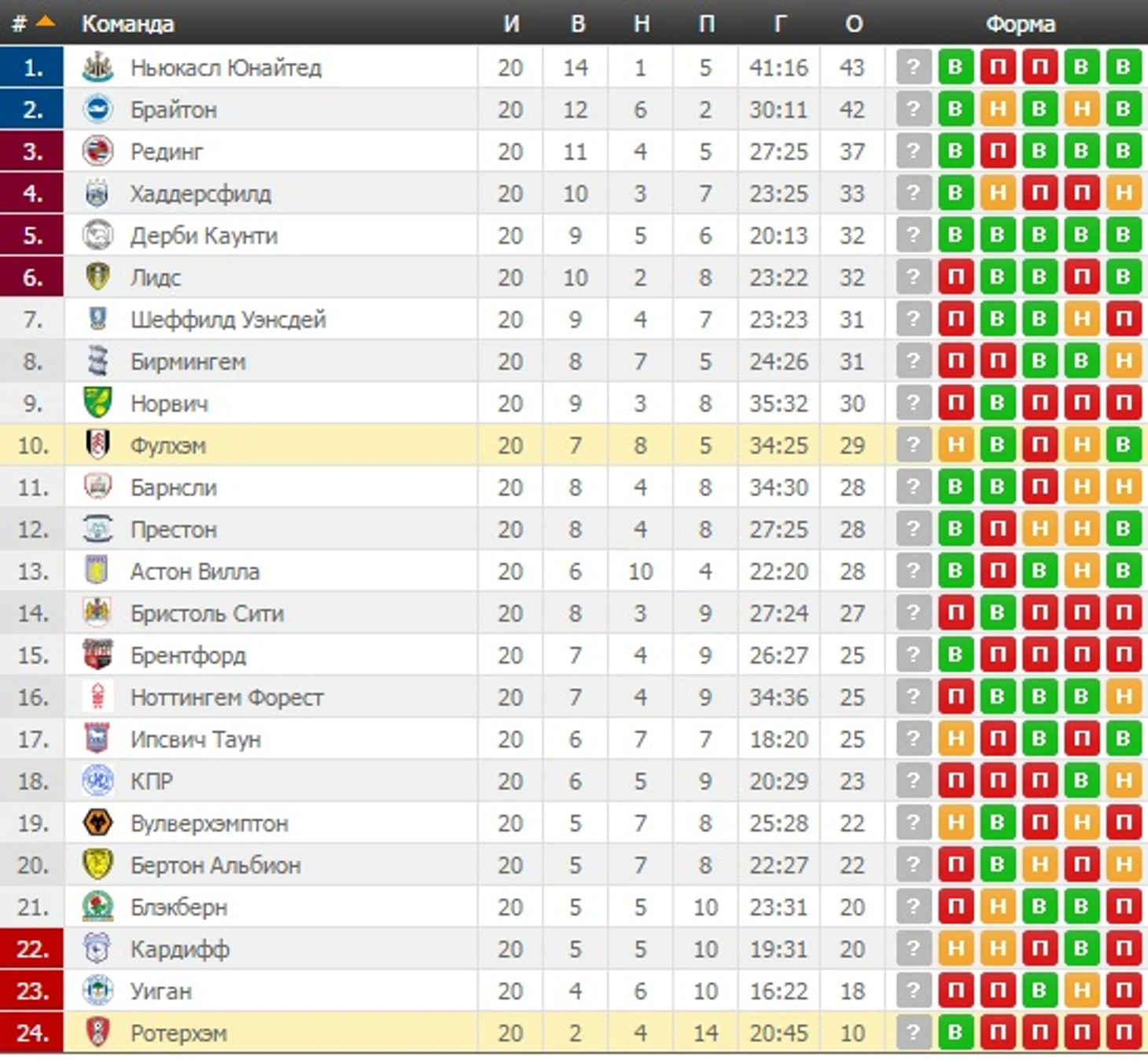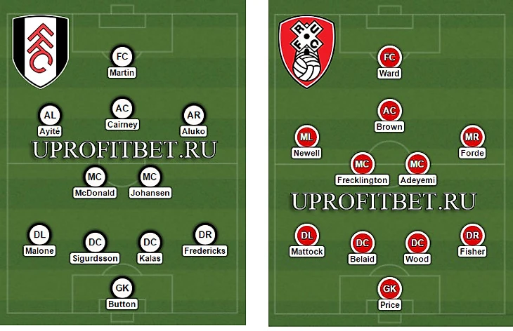 Фулхэм (4-2-3-1): Button (20/0) — Malone (14/2), Sigurðsson (12/0), Kalas (14/1), Fredericks (7/0) — McDonald (17/3), Johansen (11/3) — Ayité (13/2), Cairney (19/5), Aluko (19/4) — Martin (15/6)