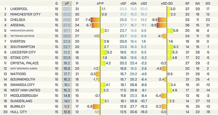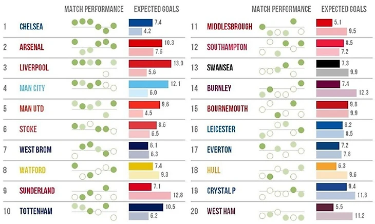 Сортировка по количеству очков за последние 6 игр. Match performance показывает справедливость результата (выше горизонтальной линии играли лучше соперника, ниже - хуже; последние игры справа; зеленый окрас - победа, светло-зеленый - ничья, полый - поражение). Expected goals: ожидаемые голы (сверху забитые, снизу пропущенные).