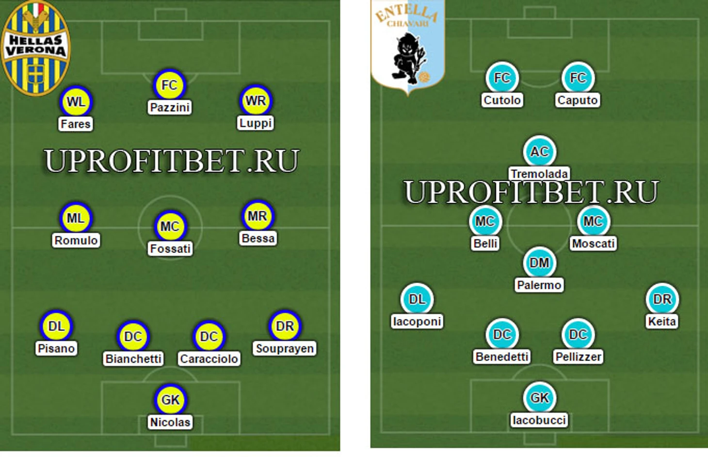 Энтелла (4-3-1-2): Iacobucci (18/0); Iacoponi (18/1), Benedetti (4/0), Pellizzer (17/2), Keita (11/0); Belli (16/0), Palermo (7/0), Moscati (15/0); Tremolada (16/3); Cutolo (11/1), Caputo (18/9)