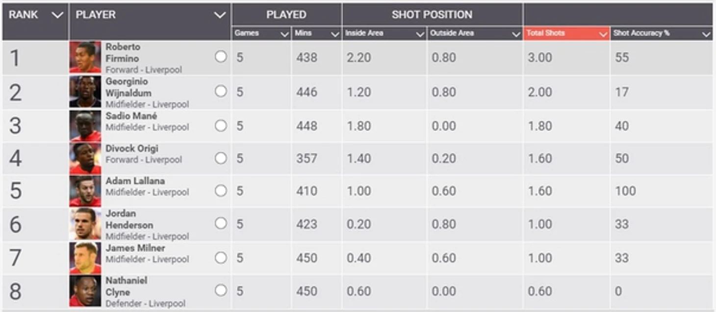 Сандерленд - Ливерпуль. xG: 18 оборона против 2 атаки. Первые, в предыдущем туре были унижены "Бернли", вторые же обыграли одного и своих соперников за лидерство. Не вижу никаких предпосылок к потери очков "мерсисайдцами". "Сандерленд", как типичный андердог дома может пару раз огрызнуться, но ничего больше. В домашней игре с "Челси", 4 тура назад, "коты" не создали ни одного явного голевого момента. График в последних турах чуть хуже и гостей, но длина скамейки у Клоппа такая, что не до ротаций. Единственная замена может быть в центре нападения (Старридж вместо Ориги). Рассматриваем в состав линию атаки. Я бы особо обратил внимание на Фирмино, который в последних турах очень часто бьет по воротам (см. таблица ниже), но забил всего 1 гол - парня просто обязано прорвать. Защитную линию, ввиду усталости, я бы все же не рассматривал (но если есть желание, то советовал бы Ловрена, который чаще других выигрывает верховые дуэли, а соперник пропустил уже 9 голов головой, что является 3-им показателем в лиге).