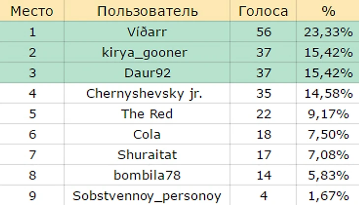Всем привет! Таковы результаты первого этапа голосования за право участвовать в «Лиге капперов».