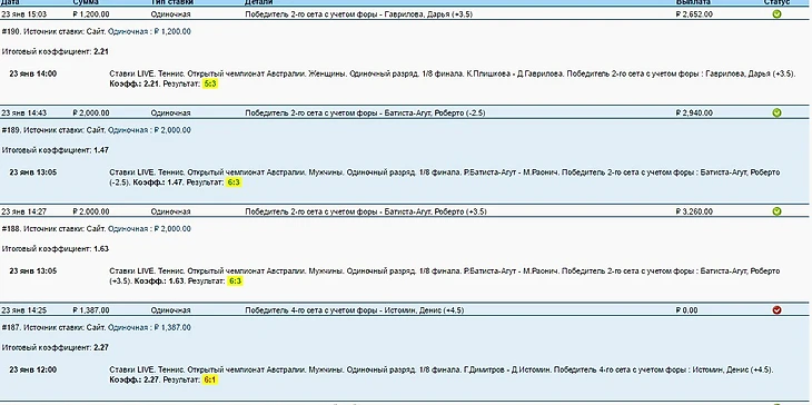 Конечно делаем вывод, что теннис вообще не ахти, а футбол прекрасен) Ну на АТР 250 прошлые недели я очень хорошо поднимал, Австралия не удается, но мы продолжим играть как на футболе , так и на теннисе. Обещал результат + 30%, сделал 25. Ну что то рядошком. Учитывая то, что в пятницу мы были еще в минусе, но я шел до последнего и не сдавался, и всегда буду так идти. А кто будет идти со мной, тот обещаю будет поднимать деньги.