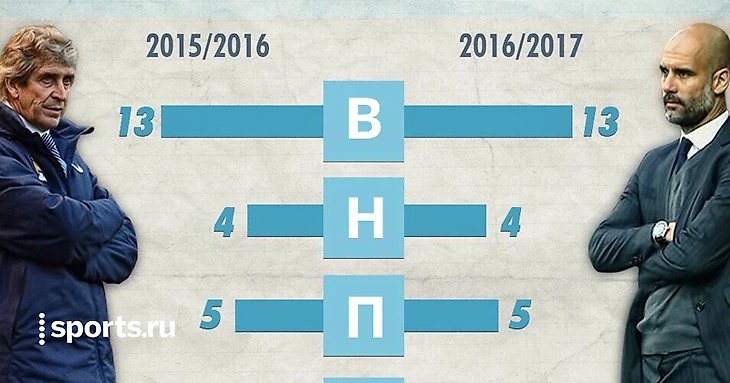 После 22 матчей в АПЛ у Хосепа Гвардьолы и Мануэля Пеллегрини идентичные показатели набранных очков и забитых мячей. Современная версия «Манчестер Сити» пропускает даже больше (28 против 21 в прошлом сезоне).