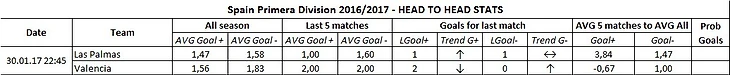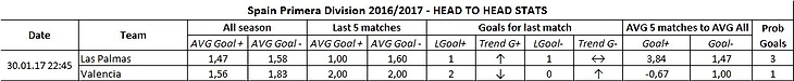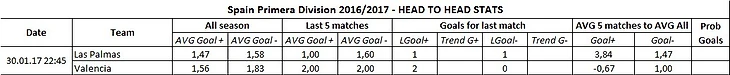 Так, "Лас-Пальмас" в чемпионате по сезону забивает в среднем 1,47 гола в ворота соперников, а в последних 5 матчах чемпионата в среднем забил 1,00 голов (в абсолютном выражении 5 голов). Соответственно, для того, чтобы "Лас-Пальмасу" вернутся к своей сезонной статистике, ему необходимо в предстоящем матче забить 3,84. Собственно, это значение и указано в таблице в столбце "AVG 5 matches to AVG All". Такой же расчет делается и в случае с пропущенными голами (соответствующие значения также указаны в таблице).