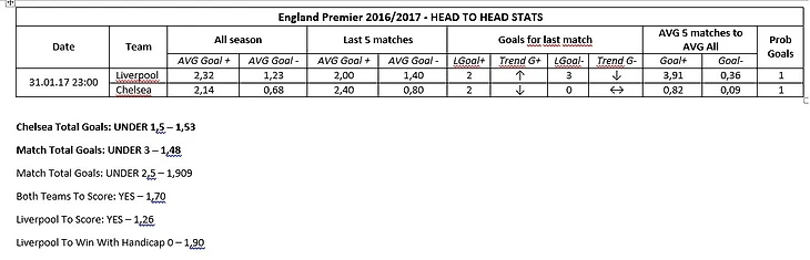 Сразу оговорюсь, что этот метод анализа не стоит рассматривать как панацею от лузов и, конечно же, совершенно не правильно ставить бездумно, опираясь на только на результаты этого анализа. Однако такой подход вполне применим для того, чтобы, что называется "собрать мысли в кучу" и определить правильный вектор анализа матча и подбора варианта ставки.