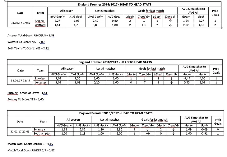H2H статистика матчей 31.01.2017 или Очередной эксперимент в анализе футбольных матчей