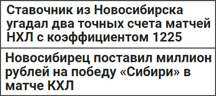 Житель Новосибирска поставил миллион рублей на победу местной «Сибири» в домашнем матче регулярного чемпионата Континентальной хоккейной лиги (КХЛ) против владивостокского «Адмирала». Фотографию квитанции из букмекерской конторы в Twitter разместила пресс-атташе новосибирской команды Мария Левинская.