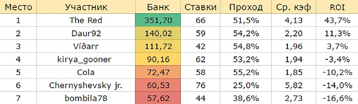 4) может и не стоит выгонять всех минусовых, но драйва турниру не хватает. Пусть будет три призовых места, и как минимум пара вылетевших. Минимум болота, пусть у всех сохраняется стимул.