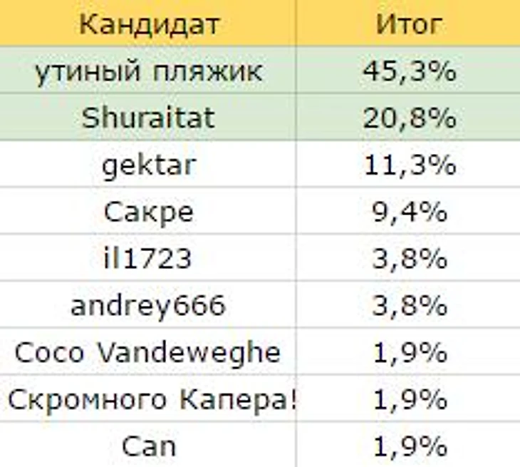 Просьба всем участникам отписаться мне на почту (см. профиль), чтобы получить доступ к таблице. Победители народного голосования также получат доступ к голосовалке. Все остальные участники попадают во второй дивизион турнира.